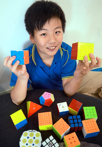 Lim chụp hình với những hình khối rubik khác nhau mà em sử dụng trong các cuộc thi. Ảnh: Joyce Peh.