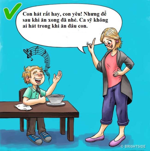 Hãy thể hiện khả năng diễn xuất và trí tưởng tượng vui nhộn của bạn để dạy cho con làm như vậy. Nhiều vấn đề sẽ được giải quyết nhanh hơn không phải thông qua các quy tắc mà với sự hài hước dù trong những tình huống nan giải.