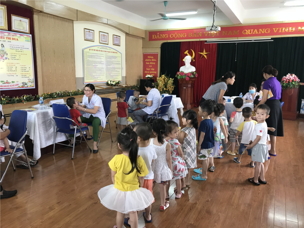 Thực hiện theo kế hoạch nhiệm vụ năm học 2018 – 2019 của trường mầm non Đô Thị Việt Hưng, bộ phận y tế trường phối hợp với các bác sĩ của Trung tâm y tế Quận Long Biên tổ chức khám sức khỏe lần 1 cho 100% học sinh. Trong buổi khám, các bé đã được khám tất cả các chuyên khoa như: Tai, mũi, họng, răng hàm mặt, nghe tim, phổi, … Các bé đã được nghe các bác sỹ dặn dò và hướng dẫn cách vệ sinh răng miêng, cách rửa tay bằng xà phòng và cách giữ gìn chân tay sạch sẽ.
