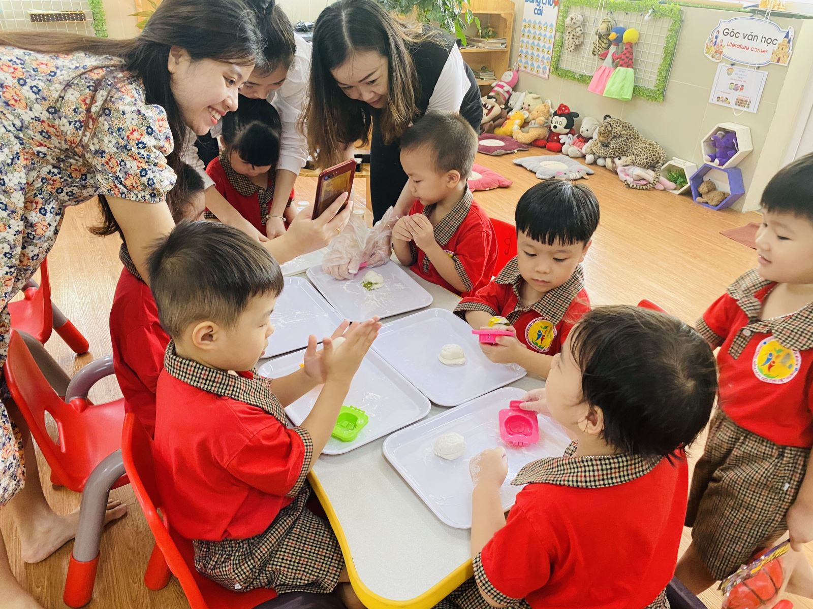 Sau đâ !important;y là một vài hình ảnh về quá trình thực hiện dự án trung thu “Làm bánh dẻo” của các bé khối mẫu giáo nhỡ trường mầm non Đô thị Việt Hưng: