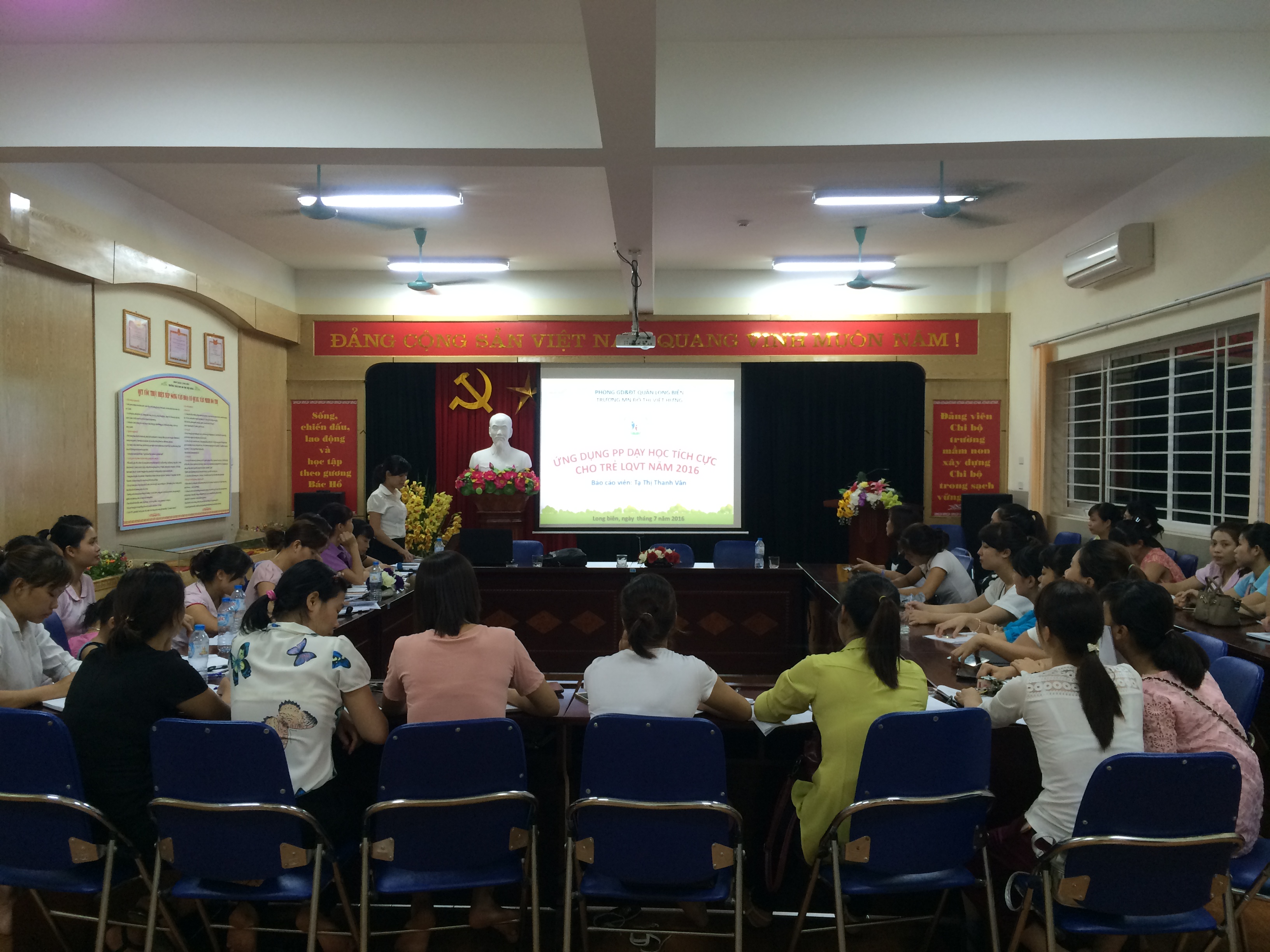 Bậc học Mầm non là bậc học đầu tiên của hệ thống giáo dục quốc dân, có nhiệm vụ chăm sóc, nuôi dưỡng và giáo dục, hình thành cho trẻ cơ sở ban đầu của nhân cách con người mới xã hội chủ nghĩa Việt nam. Mục tiêu của giáo dục Mầm non là chăm sóc, nuôi dưỡng trẻ từ 0- 5 tuổi, tạo cơ sở để trẻ phát triển toàn diện về thể chất, trí tuệ, tình cảm, thẩm mỹ, kỹ năng xã hội. Đội ngũ giáo viên Mầm non là lực lượng chăm sóc giáo dục trẻ, mọi thành công hay thất bại phụ thuộc hoàn toàn vào chất lượng của đội ngũ giáo viên. Do đó, công tác bồi dưỡng chuyên môn cho giáo viên trong trường mầm non là hết sức cần thiết. Hằng năm, tổ chuyên môn trường Mầm non Đô thị Việt Hưng thường xuyên tổ chức các đợt tập huấn nhằm nâng cao trình độ chuyên môn cho tập thể giáo viên. Nội dung tập huấn của chiều 30/8 gồm các chuyên đề: