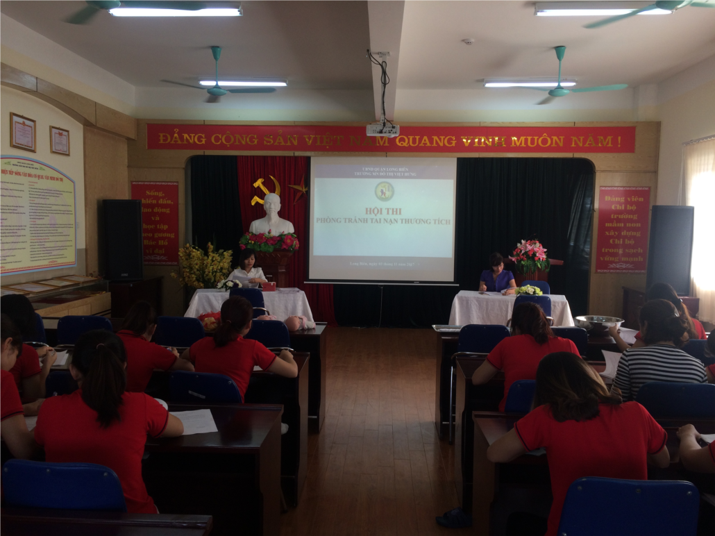 Hôm nay, 3/11/2017, trường mầm non Đô thị Việt Hưng đã tổ chức thi lý thuyết và thực hành phòng tránh tai nạn thương tích cho 100% giáo viên trong nhà trường. Hội thi là cơ hội để giáo viên được thể hiện những hiểu biết về cách xử trí các tình huống tai nạn thường xảy ra ở trẻ trong trường mầm non, trao đổi kinh nghiệm với các bạn đồng nghiệp. Đây cũng là cơ hội để các giáo viên, nhân viên khẳng định bản thân, giao lưu học hỏi, rút kinh nghiệm trong CSND – GD trẻ, xây dựng môi trường học tập an toàn, thân thiện với trẻ.