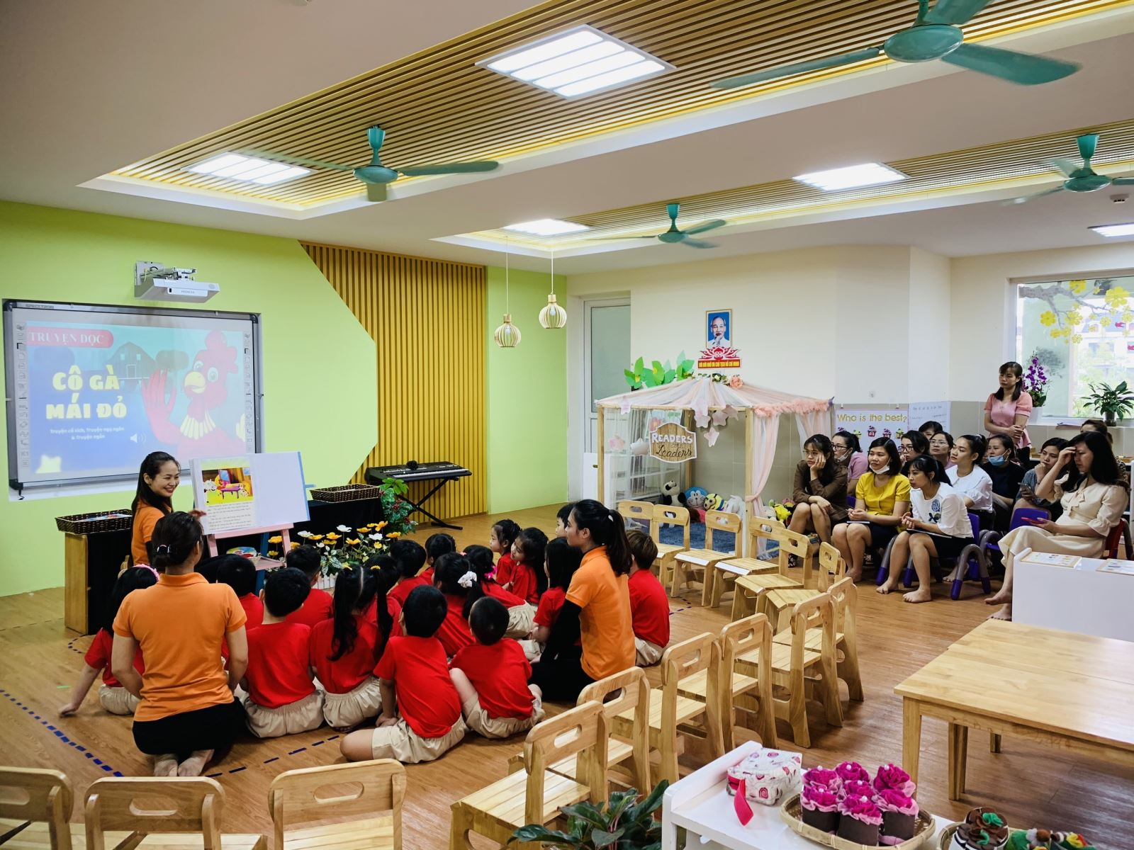 Tại lớp nhà !important; trẻ D1, dưới sự tổ chức của cô giáo Trà Giang các giáo viên được dự giờ học giáo dục âm nhạc đề tài: Âm thanh to nhỏ. Tiết học là sự đan xen hợp lý các hoạt động trải nghiệm, giúp trẻ cảm nhận được âm thanh to – nhỏ trong cuộc sống . Còn tại lớp UNIS Mango, với lĩnh vực Phát triển ngôn ngữ, cô Ánh Tuyết đã lựa chọn đề tài: Làm quen truyện: Cô gà mái đỏ. Đây thực sự là một tiết học với những trải nghiệm vô cùng thú vị . Tại buổi học trẻ kể câu chuyện theo theo ý tưởng của trẻ. Trẻ được xem tiết mục múa rối tay rất là ấn tượng. Các tiết học nhẹ nhàng, chuẩn bị đồ dùng chu đáo và kết hợp với phương pháp giáo dục tư duy cùng nghệ thuật sư phạm của giáo viên vô cùng tự tin đã khiến cho trẻ cũng như các giáo viên đến dự vô cùng thích thú. Để xây dựng được những tiết kiến tập, tổ chuyên môn đã luôn sát sao với các giáo viên từ việc lên ý tưởng, xây dựng giáo án và chuẩn bị các đồ dùng, góp ý về hình thức tổ chức dạy, nghệ thuật lên lớp…