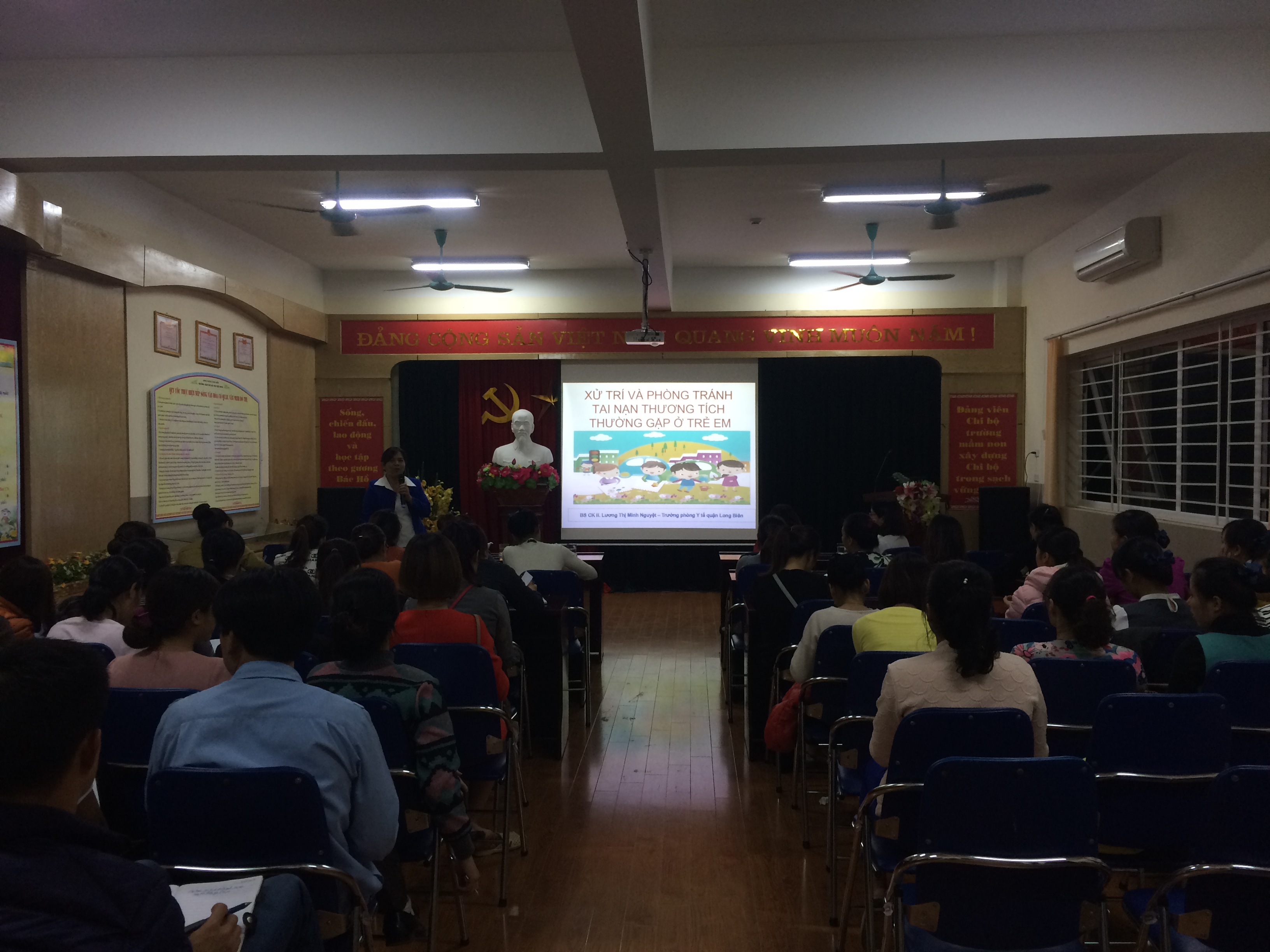 Trong buổi tập huấn, CBGV-NV đã được nghe BS: Lương Thị Minh Nguyệt – Trưởng phòng y tế quận Long Biên trao đổi về những biện pháp để đảm bảo VSATTP trong trường học cũng như trong chính gia đình chúng ta.