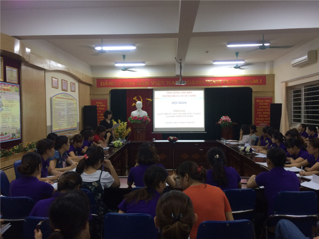 Được sự chỉ đạo của UBND quận Long Biên chiều ngày 10/10/2017, Trường MNĐT Việt Hưng tổ chức triển khai quyết định số14/2017 ngày 13/4/2017 của UBND thành phố Hà Nội. Tham dự hội nghị có các đồng chí trong BGH cùng 100% CBGVNV trong trường cũng có mặt đầy đủ.