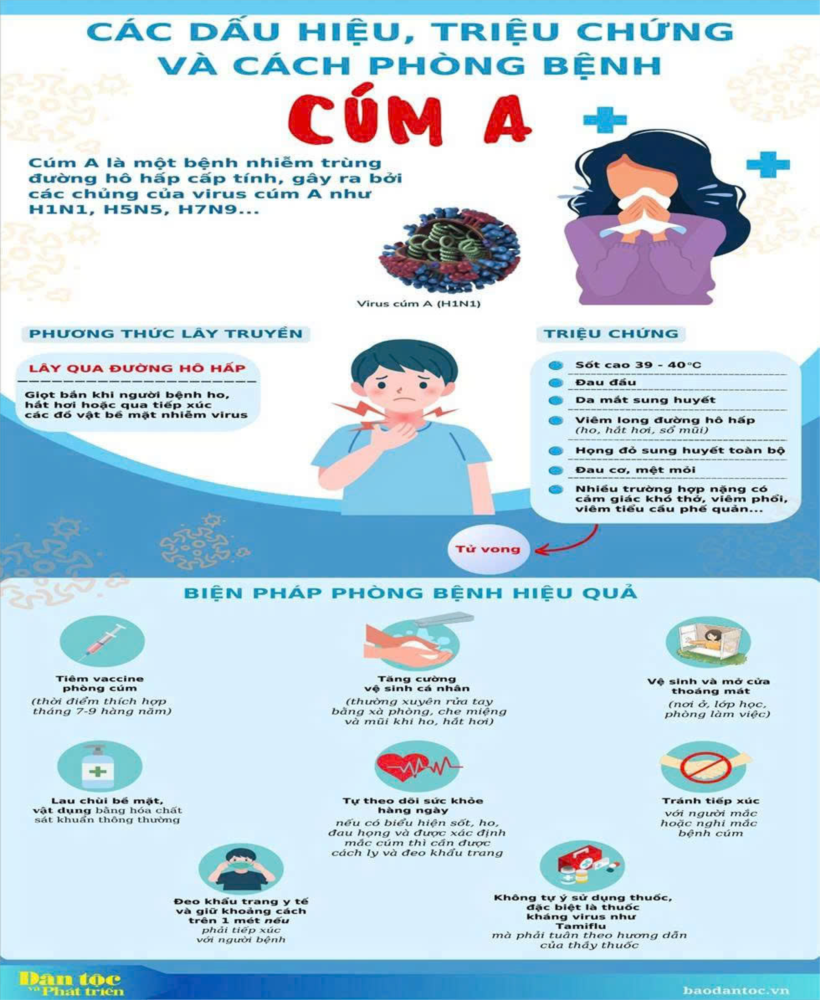 Những biểu hiện thường gặp của cúm A bao gồm: sốt cao đột ngột, ho, sổ mũi, nghẹt mũi, đau đầu, mệt mỏi, đau nhức cơ. Một số trẻ có thể kèm theo nôn, tiêu chảy hoặc chán ăn. Bệnh nếu không được theo dõi và chăm sóc đúng cách có thể dẫn tới các biến chứng như viêm phổi, viêm tai giữa, nhiễm trùng đường hô hấp, đặc biệt nguy hiểm đối với trẻ có sức đề kháng yếu.